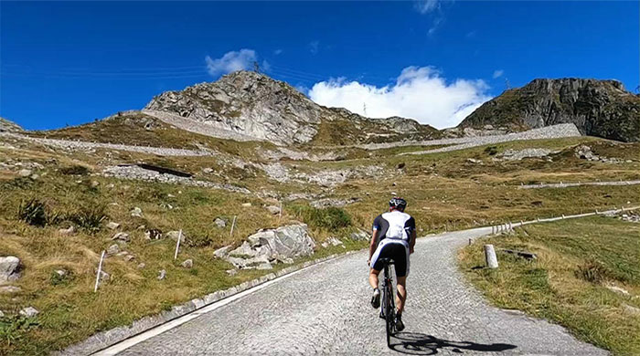 Auf ungefähr 1.400 müM kommt dann der Übergang zur Tremola. Diese historische Route hat heute noch Abschnitte mit Kopfsteinpflaster, das ursprünglich in den Jahren 1937 bis 1940 verlegt und 1951 das letztemal restauriert wurde. Die Oberfläche ist bei Nässe sehr rutschig. Die Auffahrt bietet beeindruckende Ausblicke. 24 der insgesamt 32 Kehren entfallen auf das Tremolatal, durch das häufig Fallwinde talabwärts wehen, die den Aufstieg weiter erschweren. In diesem spektakulären Abschnitt überwindet die Strasse auf einer Länge von 4 Kilometern 300 hm in eben diesen 24 Kehren, die alle einen eigenen Namen haben.